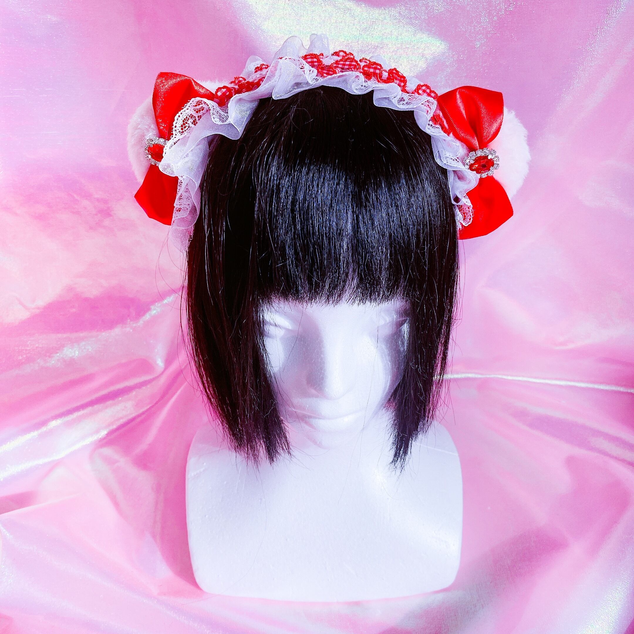 ふわふわくま耳カチューシャ ライトピンク×レッド